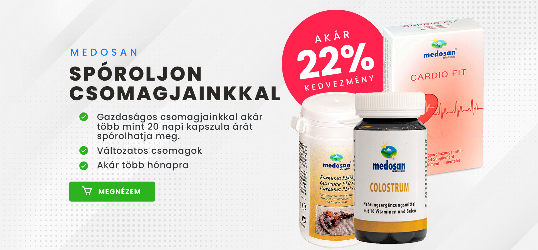 A Medosan több, mint egy évtizede a magyar piacon jelenlévő egészségmegőrző termékcsalád. A Svájcból érkező, magas színvonalat képviselő laboratóriumok által ellenőrzött termékeink segítséget nyújthatnak az immunrendszer erősítésében, az izületek védelmében, szív-és érrendszer problémáinak megelőzésében, valamint a fiatalság fenntartásában.